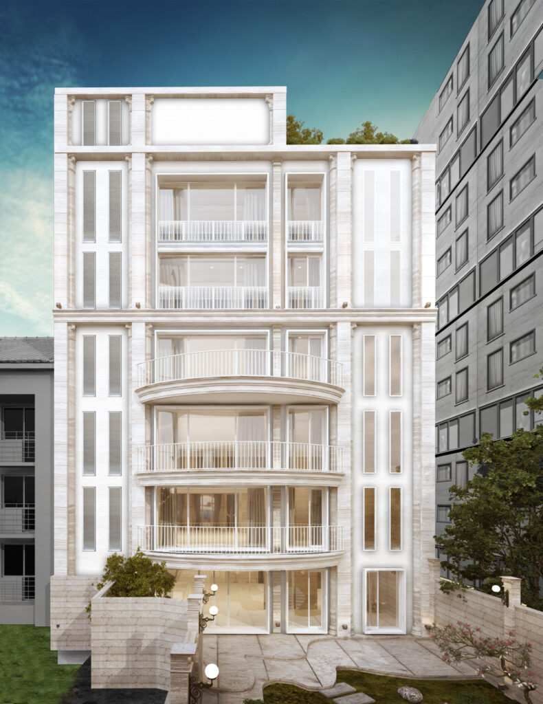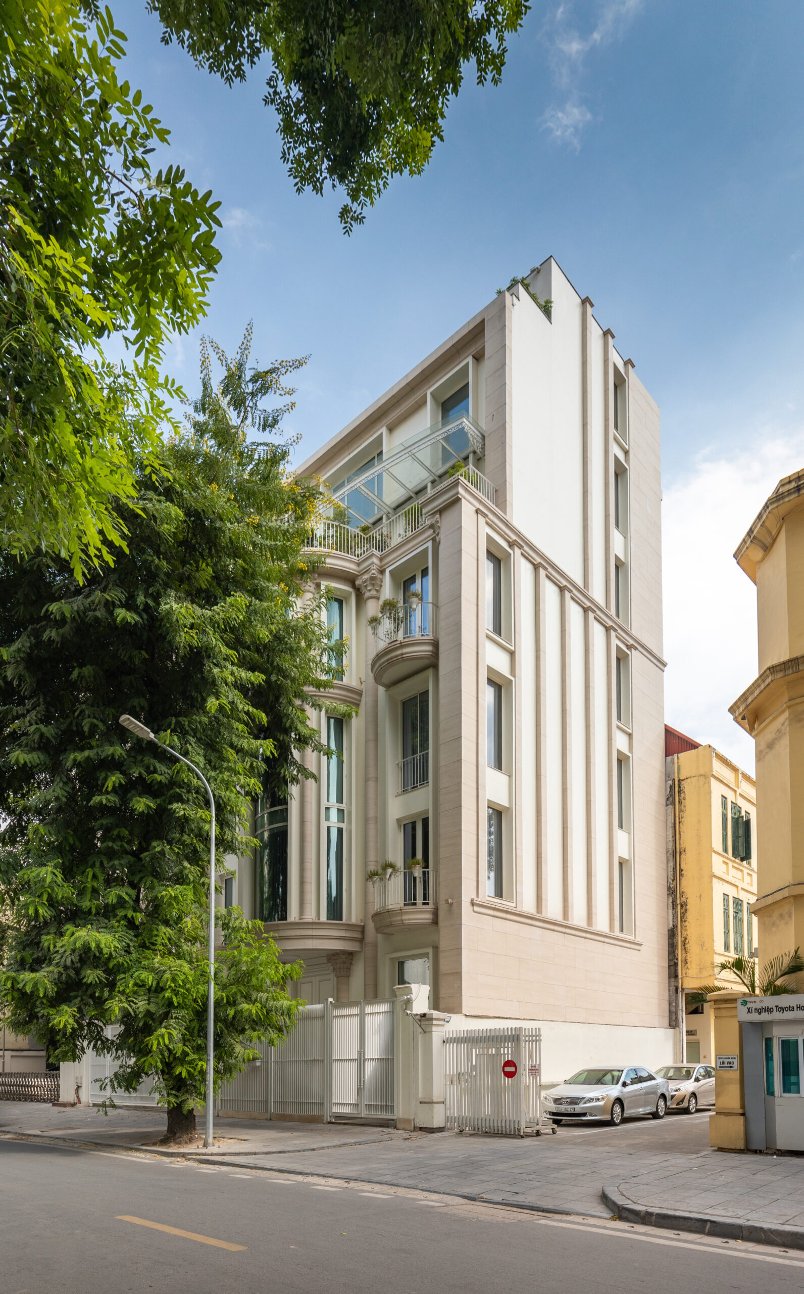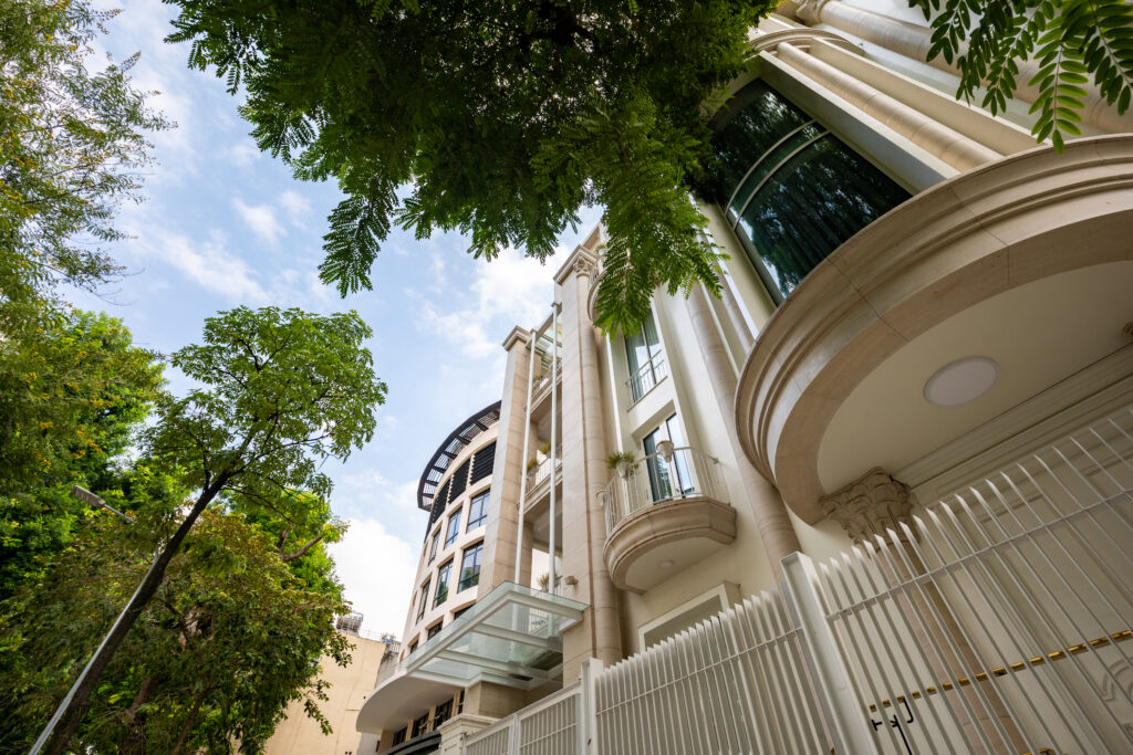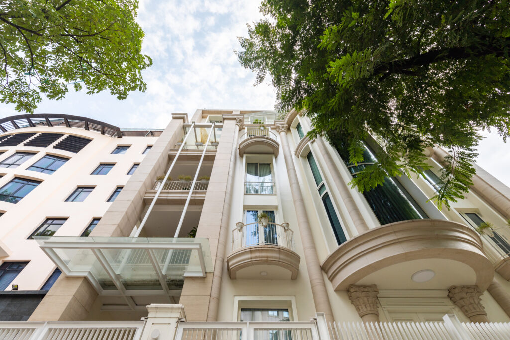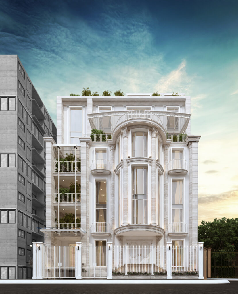 Biệt thự được lấy cảm hứng từ kiến trúc Pháp, được kết hợp với phong cách hiện đại để tạo nên vẻ đẹp kiến trúc hài hòa với cảnh quan con phố, các công trình xung quanh. Thiết kế mặt ngoài biệt thự được kết hợp giữa đường nét cổ điển, đá, và kính, giữ được sự sang trọng, cổ điển mà vẫn đảm bảo công năng, hiện đại và sự cao cấp. Do vị trí biệt thự nằm ngay tại tuyến phố trung tâm, gần nhiều công trình biểu tượng của thành phố, vậy nên việc lựa chọn phong cách cổ điển đã tạo nên sự hài hòa nhưng vẫn có điểm nhấn riêng. Biệt thự nằm tại trung tâm Hà Nội, các kiến trúc sư đã tính toán hợp lý để công trình đảm bảo được hầm đỗ xe ô tô và vườn cảnh quan sau nhà , để tạo nên sự tiện nghi và sự tiện lợi xứng đáng với giá trị khu đất và giá trị công trình.