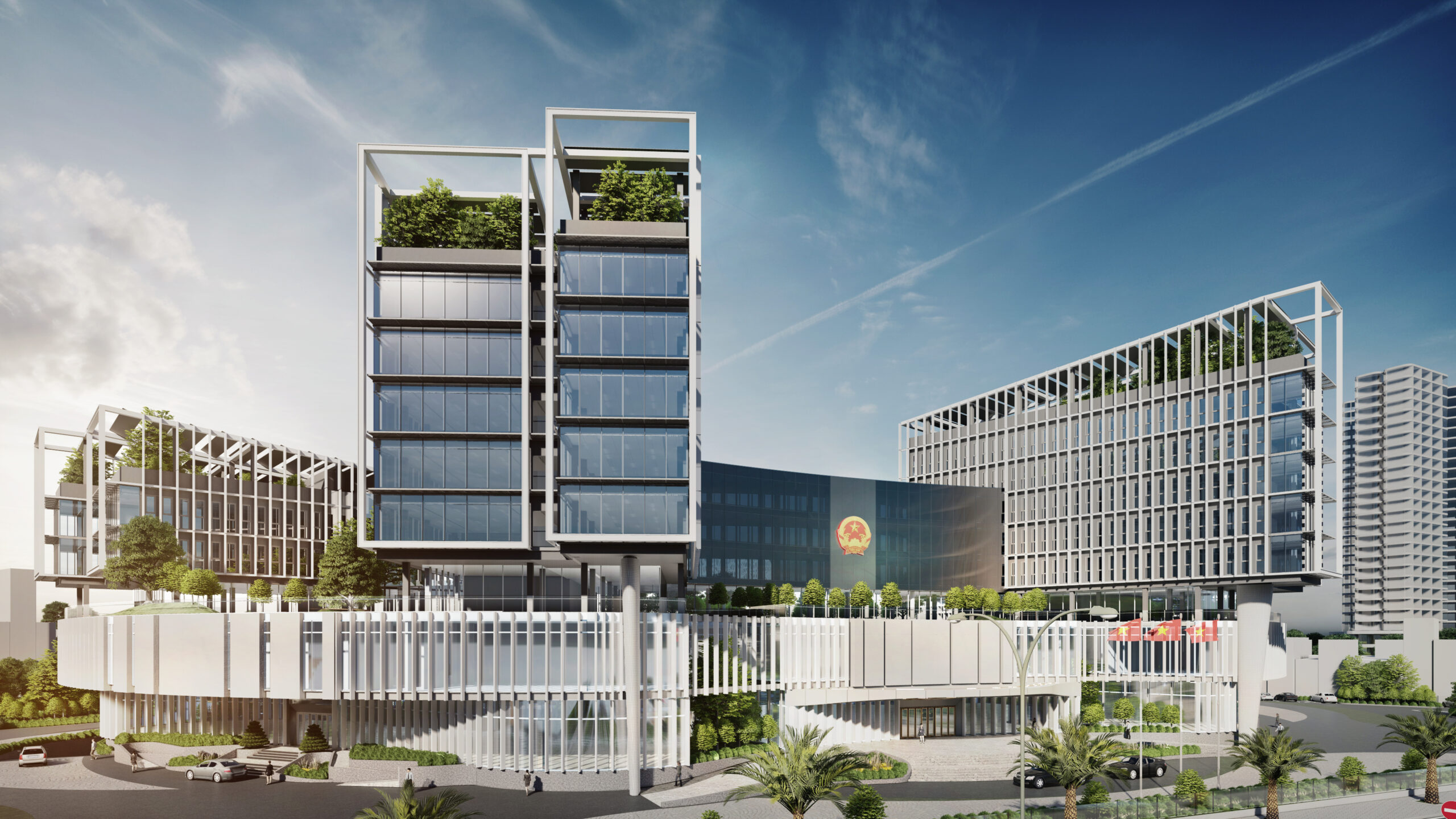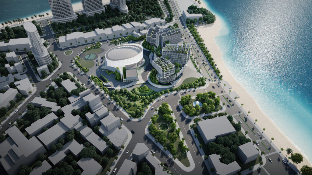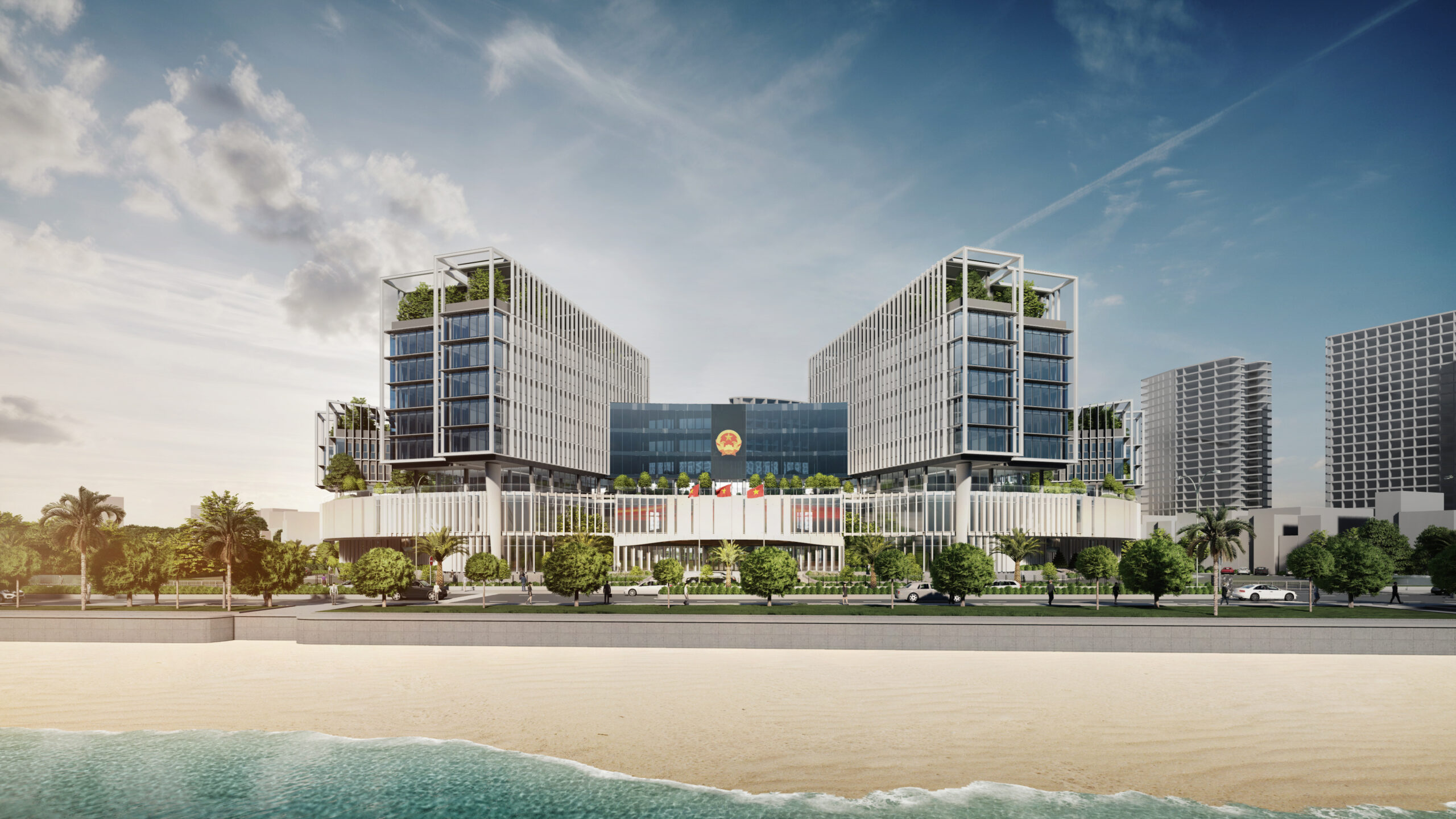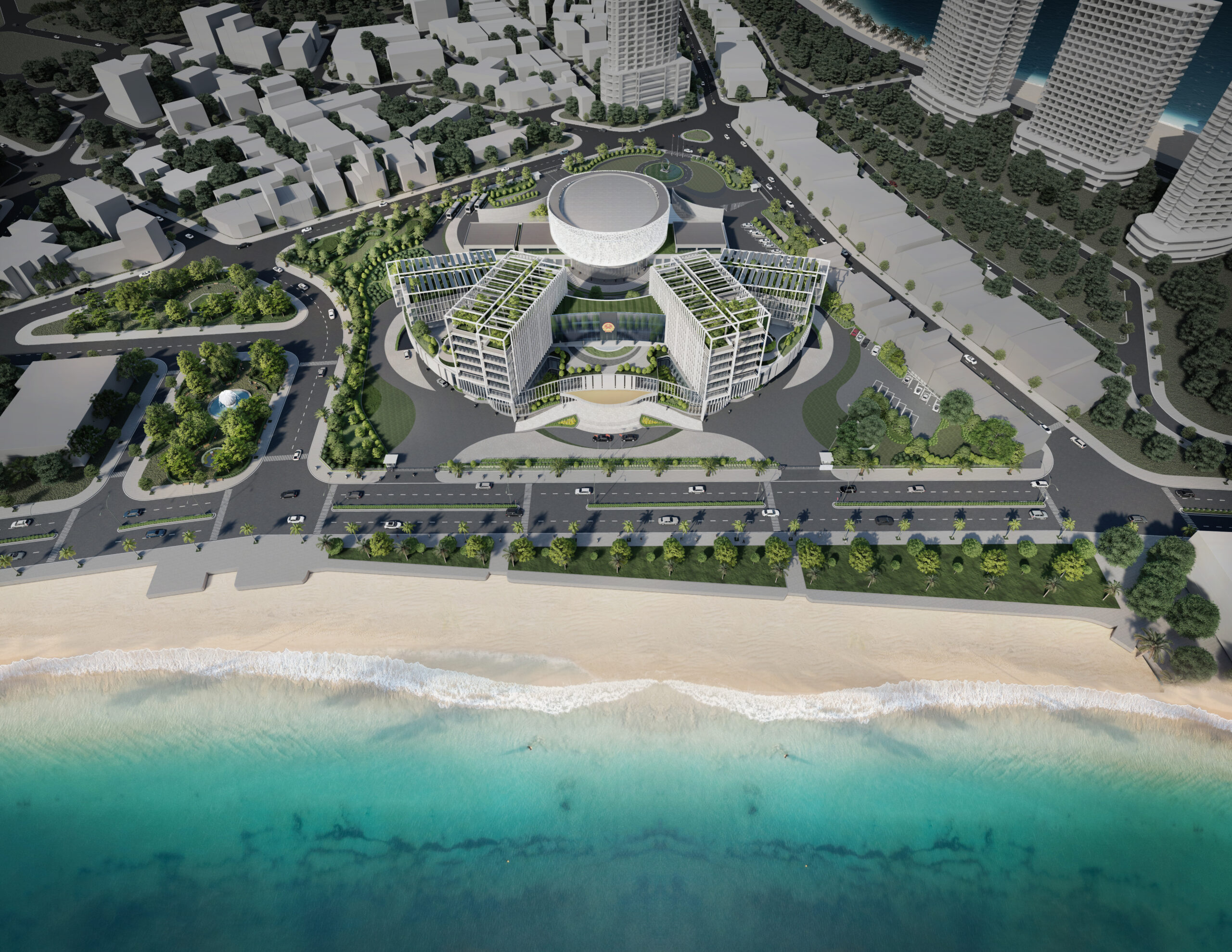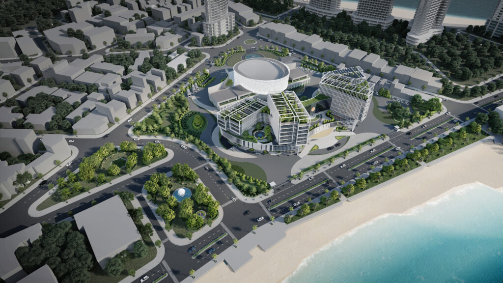 Khối đế được tổ chức các phòng ban tiếp dân và các gian phòng công cộng, tạo nên một hình thức thân thiện, dễ dàng tiếp cận đối với cộng đồng và thuận lợi trong việc thoát hiểm khi có sự kiện tập trung đông người. Đối với người dân khi tiếp cận công trình, các đường cong của tầng 1 và 2 sẽ tạo nên thiện cảm, giảm bớt sự khô cứng, phù hợp với tinh thần địa phương ven biển phóng khoáng. Cùng lúc đó, khối tháp được thiết kế khỏe khoắn giữ vững tính trang trọng như những ngọn núi vươn lên bên trên sóng nước. Khối tháp không được tổ chức hợp khối, nhằm tránh tạo thành một bức tường cao chắn trước mặt biển như nhiều công trình đã làm, thay vào đó hạ thấp chiều cao công trình, các khối hướng theo cánh cung như sự chào đón. Các khối được phân tách dựa trên sự tách biệt về công năng với các mặt bằng vuông vắn, dễ tổ chức, phân chia linh động phòng ban. Đặc biệt, giúp thuận tiện quản lý tòa nhà về năng lượng và kiểm soát an ninh từng khối cơ quan. Các khối tháp được sắp đặt theo các hướng cánh quạt, mở rộng về phía biển, đón nắng hướng Đông và giảm thiểu tối đa diện mặt đứng tiếp xúc với ánh nắng hướng Tây. Vào các giờ trong ngày, các khối tạo nên bóng đổ bao che nhưng vẫn đảm bảo tối đa lấy sáng tự nhiên.