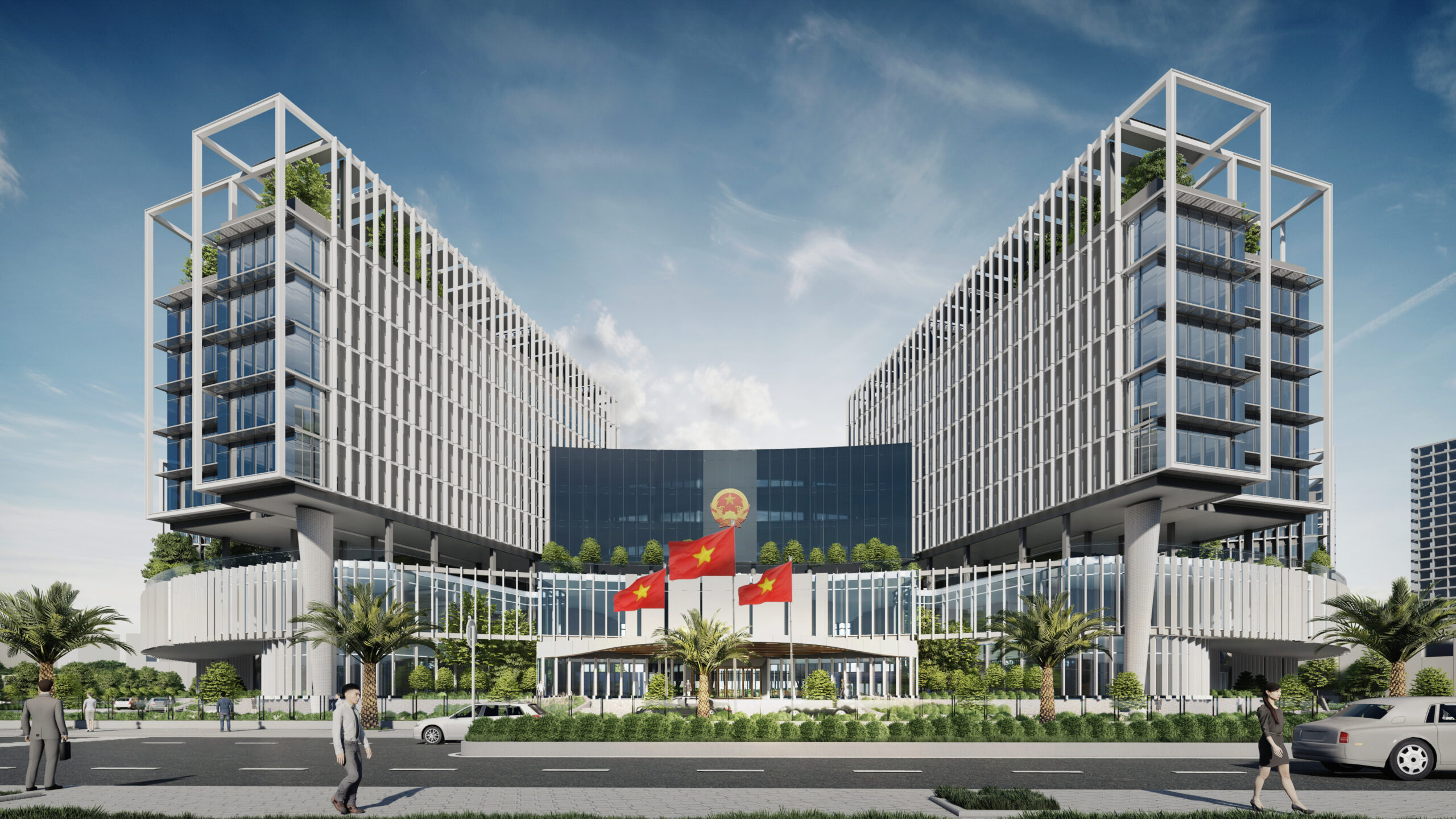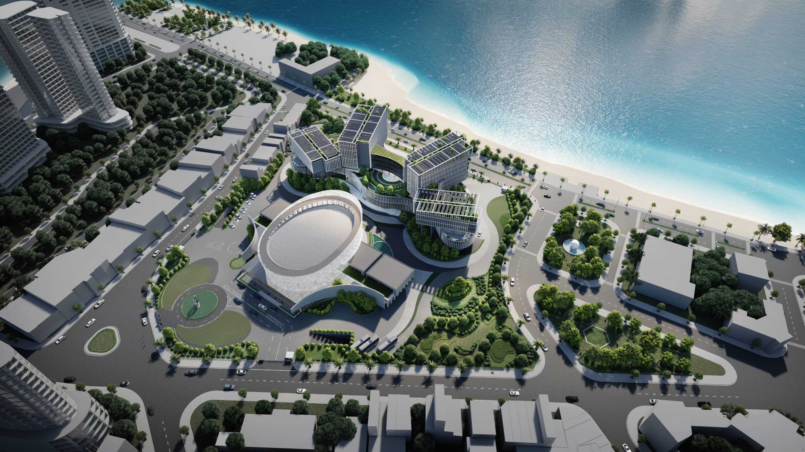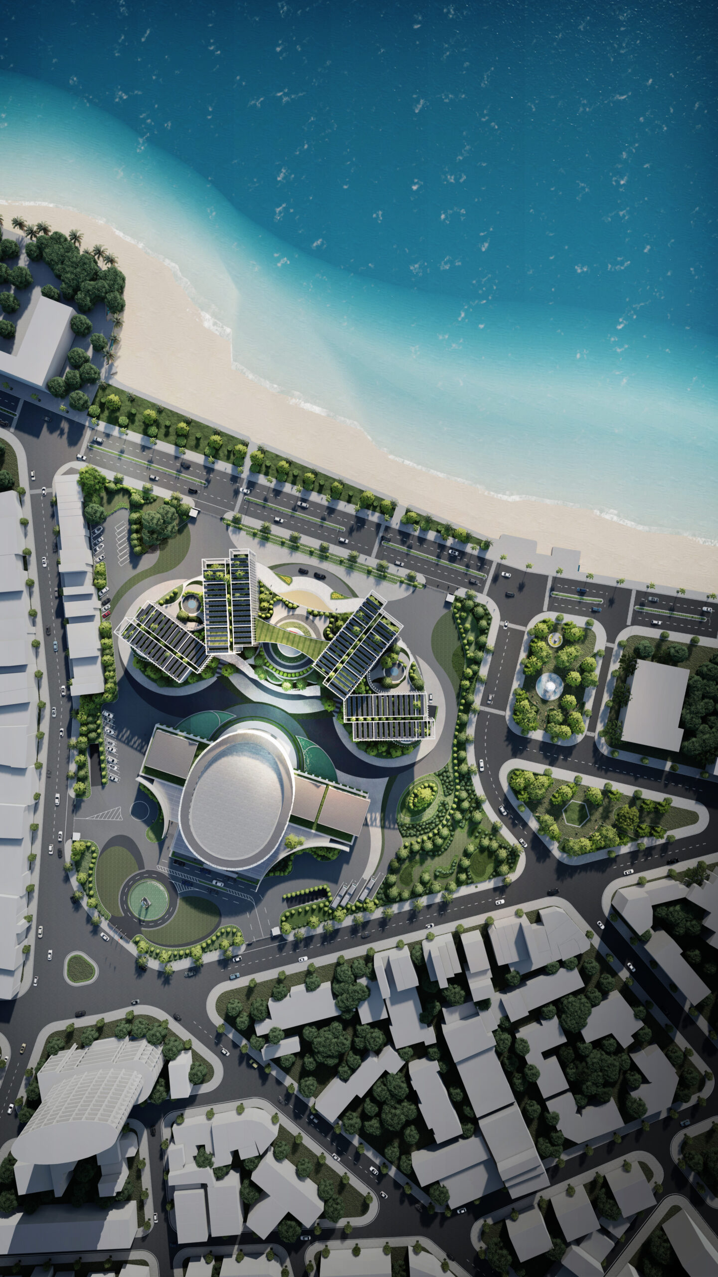 Khối đế được tổ chức các phòng ban tiếp dân và các gian phòng công cộng, tạo nên một hình thức thân thiện, dễ dàng tiếp cận đối với cộng đồng và thuận lợi trong việc thoát hiểm khi có sự kiện tập trung đông người. Đối với người dân khi tiếp cận công trình, các đường cong của tầng 1 và 2 sẽ tạo nên thiện cảm, giảm bớt sự khô cứng, phù hợp với tinh thần địa phương ven biển phóng khoáng. Cùng lúc đó, khối tháp được thiết kế khỏe khoắn giữ vững tính trang trọng như những ngọn núi vươn lên bên trên sóng nước. Khối tháp không được tổ chức hợp khối, nhằm tránh tạo thành một bức tường cao chắn trước mặt biển như nhiều công trình đã làm, thay vào đó hạ thấp chiều cao công trình, các khối hướng theo cánh cung như sự chào đón. Các khối được phân tách dựa trên sự tách biệt về công năng với các mặt bằng vuông vắn, dễ tổ chức, phân chia linh động phòng ban. Đặc biệt, giúp thuận tiện quản lý tòa nhà về năng lượng và kiểm soát an ninh từng khối cơ quan. Các khối tháp được sắp đặt theo các hướng cánh quạt, mở rộng về phía biển, đón nắng hướng Đông và giảm thiểu tối đa diện mặt đứng tiếp xúc với ánh nắng hướng Tây. Vào các giờ trong ngày, các khối tạo nên bóng đổ bao che nhưng vẫn đảm bảo tối đa lấy sáng tự nhiên.