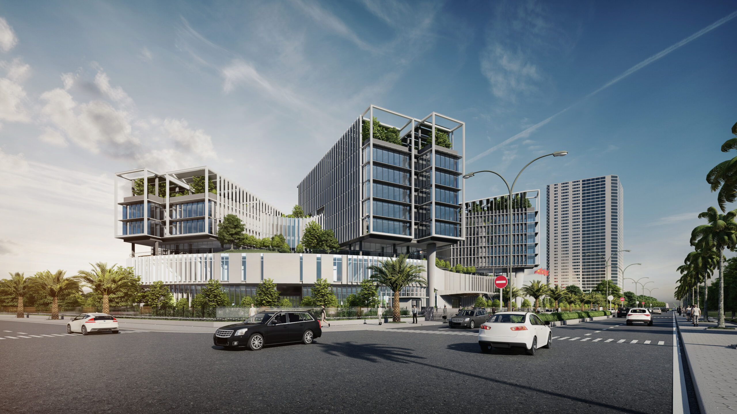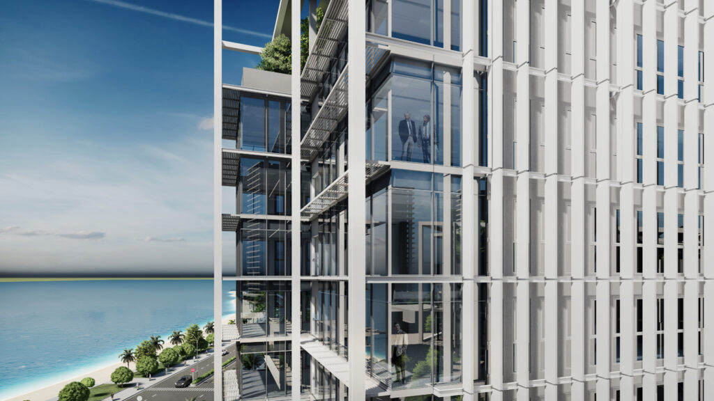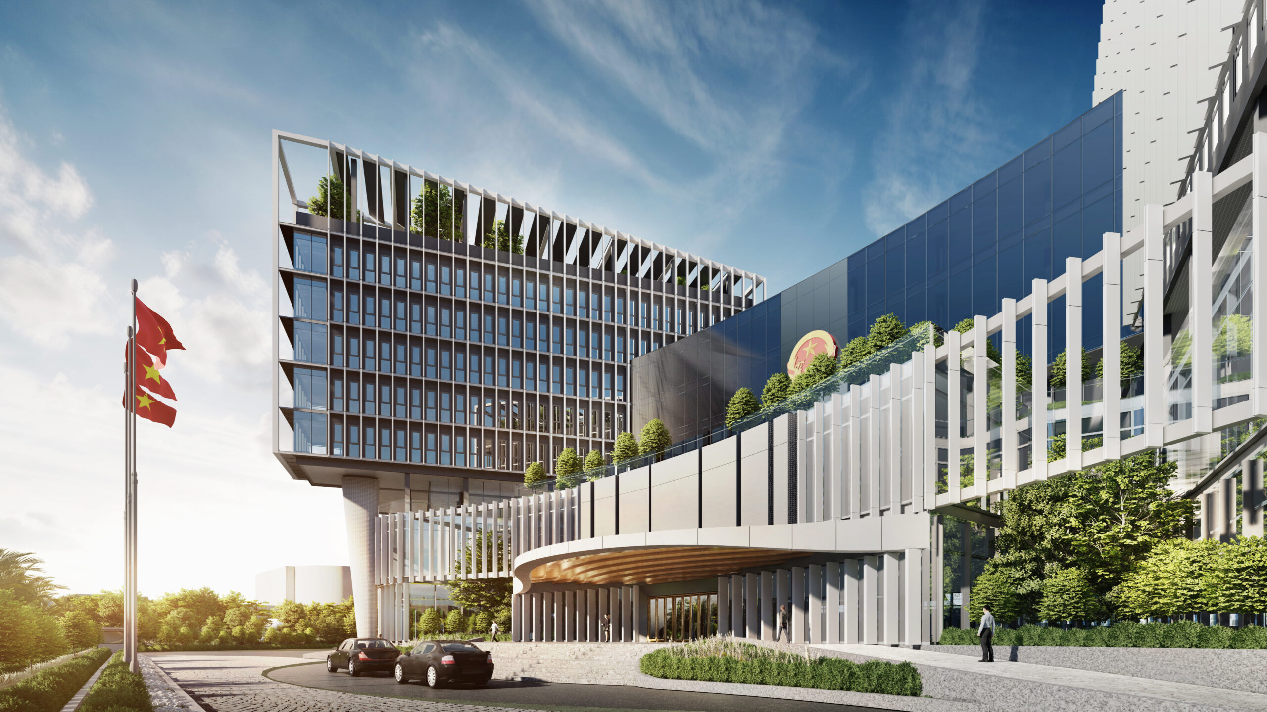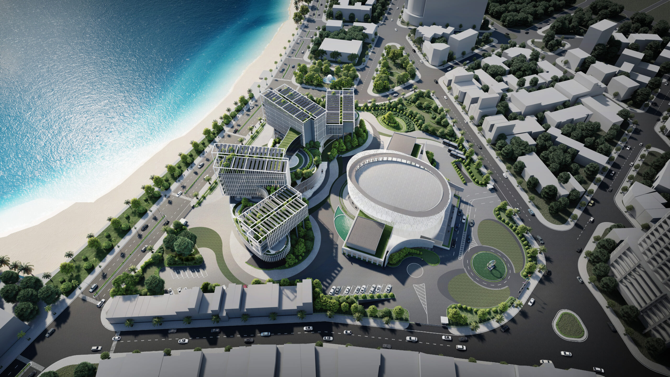 Khối đế được tổ chức các phòng ban tiếp dân và các gian phòng công cộng, tạo nên một hình thức thân thiện, dễ dàng tiếp cận đối với cộng đồng và thuận lợi trong việc thoát hiểm khi có sự kiện tập trung đông người. Đối với người dân khi tiếp cận công trình, các đường cong của tầng 1 và 2 sẽ tạo nên thiện cảm, giảm bớt sự khô cứng, phù hợp với tinh thần địa phương ven biển phóng khoáng. Cùng lúc đó, khối tháp được thiết kế khỏe khoắn giữ vững tính trang trọng như những ngọn núi vươn lên bên trên sóng nước. Khối tháp không được tổ chức hợp khối, nhằm tránh tạo thành một bức tường cao chắn trước mặt biển như nhiều công trình đã làm, thay vào đó hạ thấp chiều cao công trình, các khối hướng theo cánh cung như sự chào đón. Các khối được phân tách dựa trên sự tách biệt về công năng với các mặt bằng vuông vắn, dễ tổ chức, phân chia linh động phòng ban. Đặc biệt, giúp thuận tiện quản lý tòa nhà về năng lượng và kiểm soát an ninh từng khối cơ quan. Các khối tháp được sắp đặt theo các hướng cánh quạt, mở rộng về phía biển, đón nắng hướng Đông và giảm thiểu tối đa diện mặt đứng tiếp xúc với ánh nắng hướng Tây. Vào các giờ trong ngày, các khối tạo nên bóng đổ bao che nhưng vẫn đảm bảo tối đa lấy sáng tự nhiên.